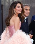 As for Amal’s showgirl look, this is Tamara Ralph Couture. Amal surprisingly loves pinks, and while this paler pink doesn’t look bad on her, she definitely looks better in a more saturated color. I’m not crazy about the tiered skirt, but that’s not specific to this look (I just don’t like tiered skirts). I also feel sorry for tall women – they should be able to wear feathers without anyone making a Big Bird comment. But yeah, the feathers are very Big Bird. Also: Amal recently took eight inches off her hair (according to Vogue). It looks SO MUCH healthier.