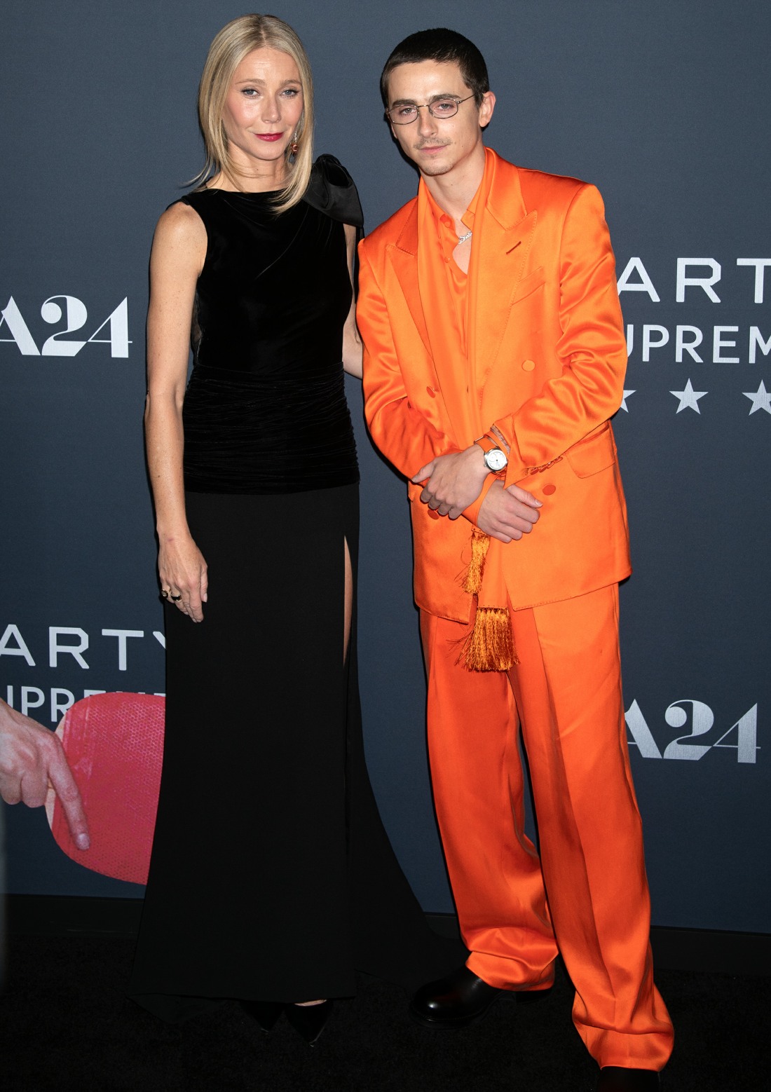 Here are some photos from last night’s NYC premiere of Marty Supreme. Timothee Chalamet wore another hideous orange ensemble, because he’s theme-dressing and the color orange is central to the film. Kylie Jenner didn’t attend this premiere – Timmy’s date was his mom. He also posed with costar Gwyneth Paltrow, who brought her kids to the premiere.