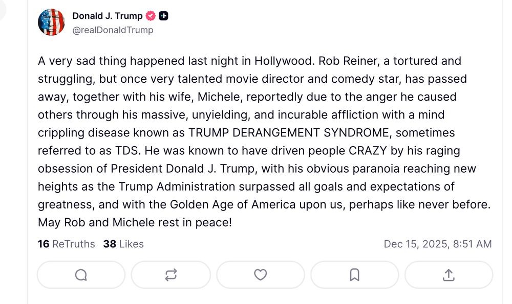 Vile. Demented. Grotesque. Yes, Donald Trump chose the murders of Rob and Michele Reiner to center himself. He couldn’t just… eulogize two Americans in a simple way, the kind of way we expect from politicians and public figures. Trump is arguing in his demented way that Rob Reiner died “due to the anger he caused others through his massive, unyielding, and incurable affliction with a mind crippling disease known as TRUMP DERANGEMENT SYNDROME.” The backlash to this post was immediate, especially since the same people snickering at Trump’s post were the people getting teachers fired from their jobs merely for expressing skepticism at the astroturfed canonization of Charlie Kirk just three months ago.