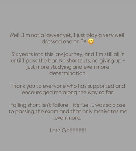 “Well…I’m not a lawyer yet, I just play a very well-dressed one on TV,” she wrote. “Six years into this law journey, and I’m still all in until I pass the bar. No shortcuts, no giving up – just more studying and even more determination.”