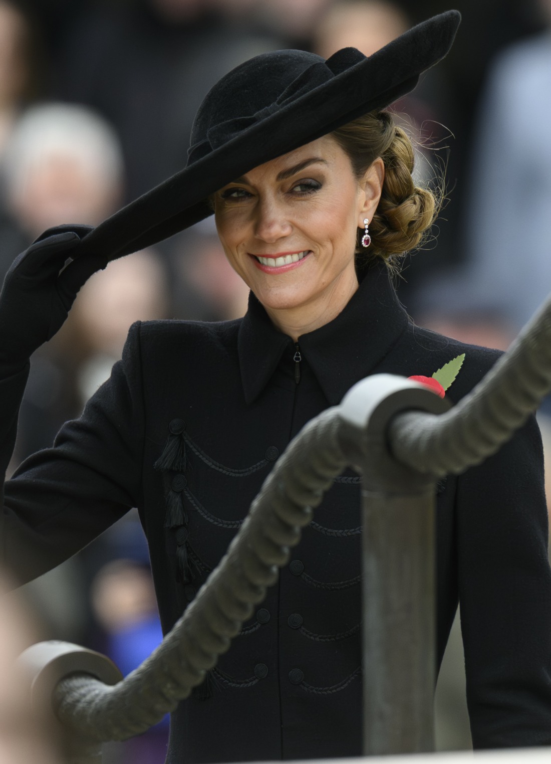 Kate wore a repeat – she’s worn this Catherine Walker coat to Remembrance Sundays in years past. I call this one her Sgt. Pepper coat because of the tassels and chest embroidery. During her outing on Sunday at the Cenotaph, I noted that Kate’s eyebrows look somewhat crazy right now. You can see it again in these photos. Is she just filling them out too much? What’s going on there?