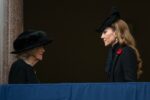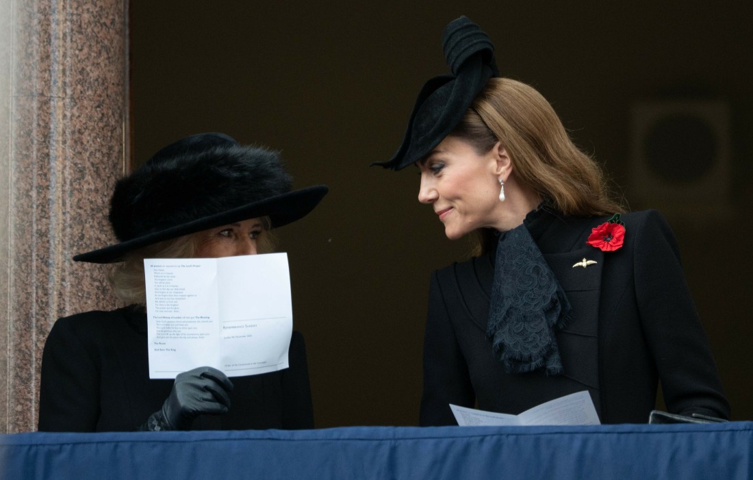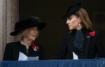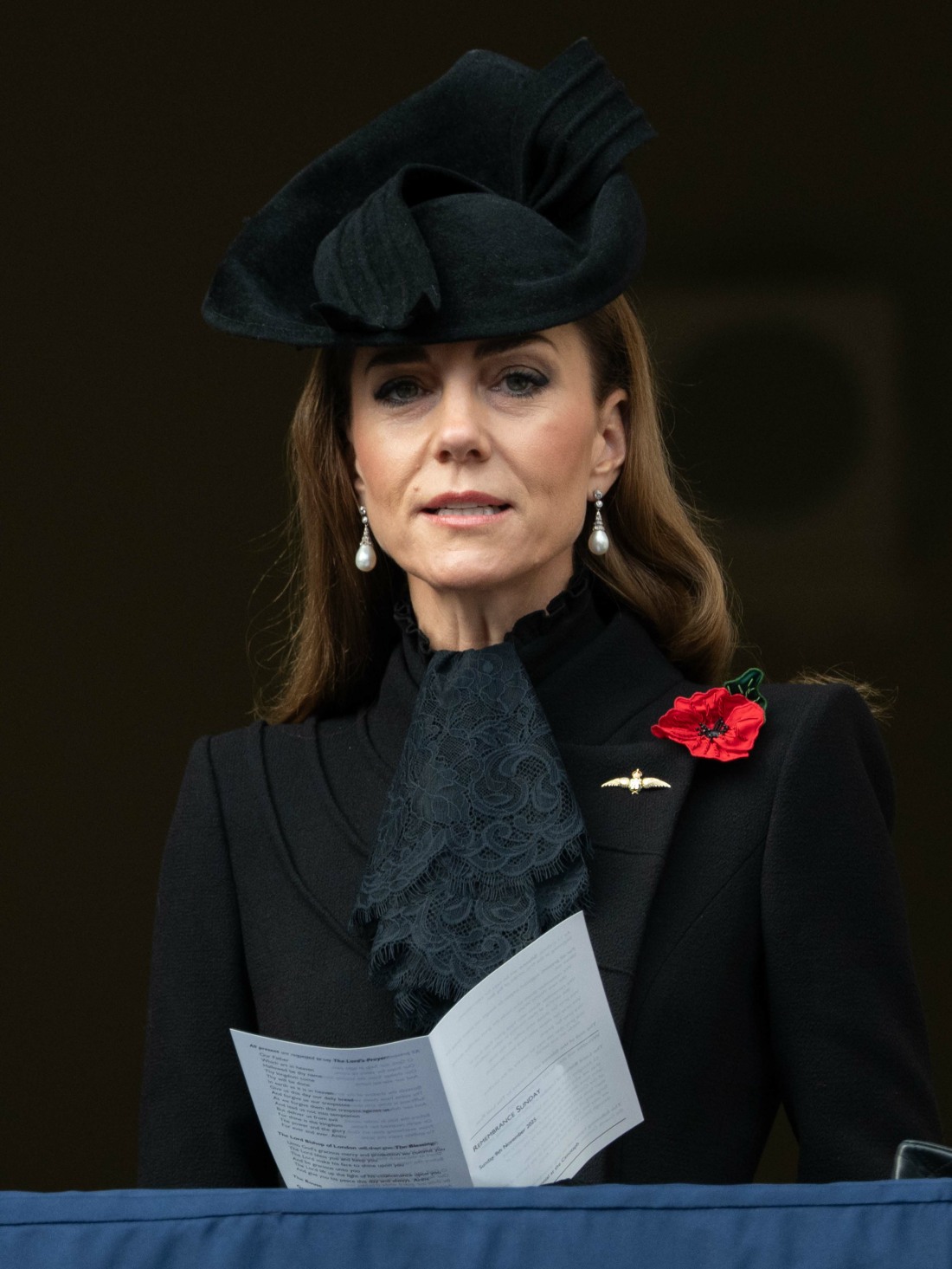 I used to get mad when the Princess of Wales repeated a black coat for Remembrance Sunday. It felt like, hey, this is one of the big dates on your calendar, just buy a new black coat. But honestly, Kate now has so many black coats and they only get pulled out for Remembrance events and the occasional funeral, so why not just stick with the pieces she already has? That’s what she did this year – she re-wore a Catherine Walker coat, the same one she wore for Remembrance Sunday in 2022. She did change the way she styled it though – she added a prissy, Victorian-looking lace ruffle and jabot, which I assume is part of the dress (or Victorian dressing gown) she’s wearing underneath the coat. Kate also wore pearl earrings (the Bahrain pearl-and-diamond ones she consistently borrows) and a poppy crafted by Izzy Ager of Lock & Co. I also think Kate’s hat is new? The hat is doing the most to obscure the fact that Kate’s eyebrows look insane, like she drew them on with a Sharpie.