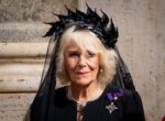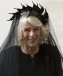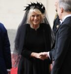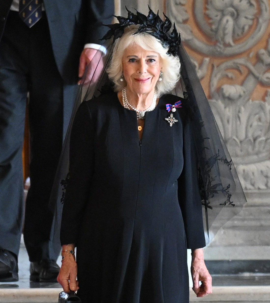 A standout accessory to her attire, Queen Camilla wore a traditional mantilla headpiece with a long black veil, designed by Philip Treacy and featuring a crown of leaf-shaped pieces. The veil of Queen Camilla’s mantilla included delicate floral embroidery, echoing the botanical inspiration of the ornate piece.