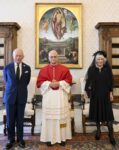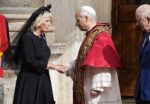 Here are more photos from King Charles and Queen Camilla’s visit to the Vatican yesterday. I’ll give Cam some credit: if she hadn’t worn that absolutely bonkers headpiece, the meeting and photos would not have gotten this much attention. I believe people were shocked by Camilla’s headpiece, honestly. I’ve looked it up – while it’s traditional for non-Catholic queens to wear a mantilla – the black veil and/or head-covering – it’s not traditional for any queen to wear the veil with this kind of large headpiece. Certainly not with a headpiece which resembles a gothic crown of crows. I’ll give Camilla some credit for it though – it’s metal as f–k. I just don’t think she intended to look so metal. Here are some additional details about Camilla’s goth look: