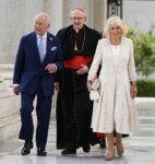 During the British royal couple’s visit to Vatican City, Queen Camilla wore a second look antithetical to her attire while meeting Pope Leo XIV. Queen Camilla wore a white dress with a flowing coat featuring delicate embroidery.