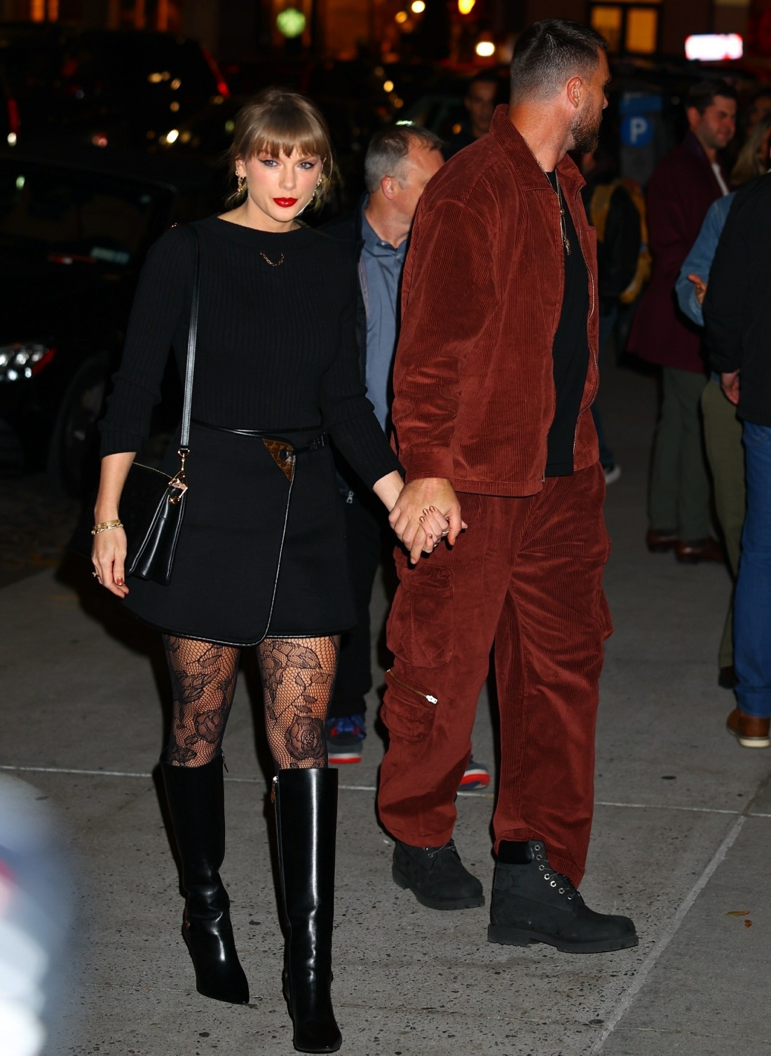 - Taylor Swift looks elegant in mini skirt and thigh high boots for Travis Kelce date night Entertainment Taylor Swift stepped out for another date night last night as she took to the streets of New York with her fiancé Travis Kelce. Taylor, 35, looked ever the sophisticated popstar, donning a wraparound black miniskirt with leather edging, and a three-quarter-length sleeve black top which she tucked in. (Picture:…