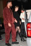 For last night’s outing, Taylor wore a Louis Vuitton knit top and miniskirt and Legacy boots. She carried a Coussin PM handbag. I want to talk about her choice in hosiery. I’m always excited when high-profile women try to bring back patterned hose or tights. While Taylor’s hose is technically “fishnet,” the floral pattern adds some pizzazz. I actually love the way she put this outfit together – the simplicity of the black top and skirt to showcase her choice in hosiery. I kind of wonder if Travis picked it out? As for Travis… a corduroy “suit” in this shade of maroon/burgundy is sort of interesting too. He’s so big, I feel like everything has to be made for him, bespoke-style.