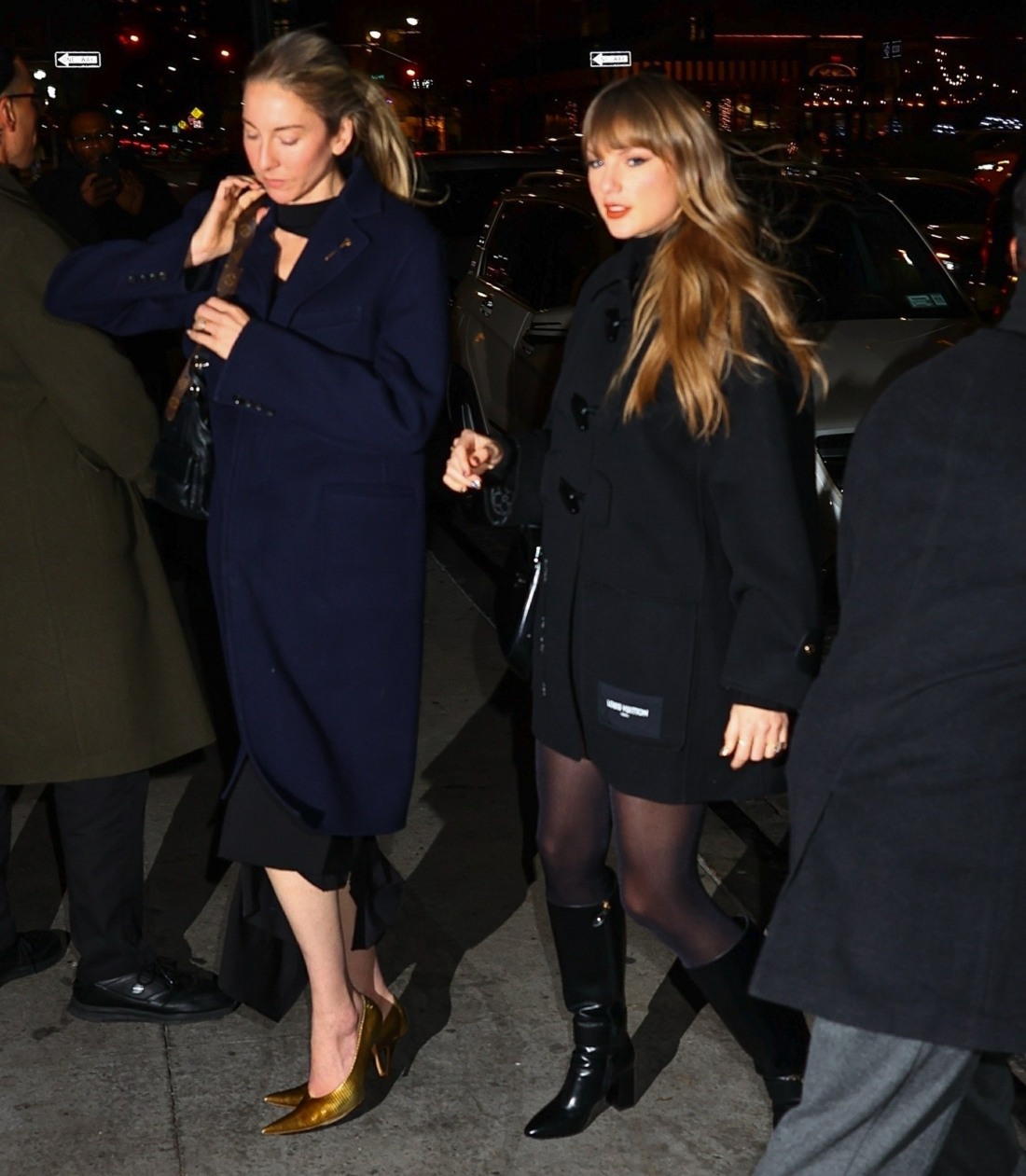 Taylor Swift was out last night in New York. She and her friend Este Haim went to Chez Marguax, one of several elite private clubs of which Taylor is a member. I actually thought this was Alana Haim, because damn, those Haim sisters look alike. But everyone swears it’s Este. Taylor’s look was appropriately wintery – it’s been cold as f–k this week on the East Coast and mid-Atlantic. Tay wore Louis Vuitton – a $6,400 toggle coat and $2,370 boots. Crazy prices, but you’re paying for that visible Louis Vuitton patch on the coat. You could probably get something equally as cute for $60 at Burlington Coat Factory, but it wouldn’t have the LV patch.