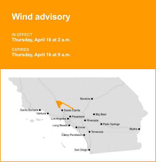5 Freeway corridor near Santa Clarita and Western Antelope Valley Foothills are under a wind advisory which was released by the National Weather Service on Wednesday at 12:36 p.m. The advisory is valid for Thursday, April 16 between 2 a.m. and 9 a.m.