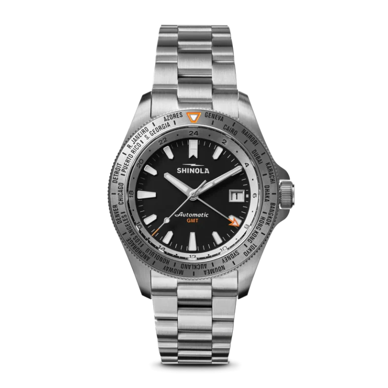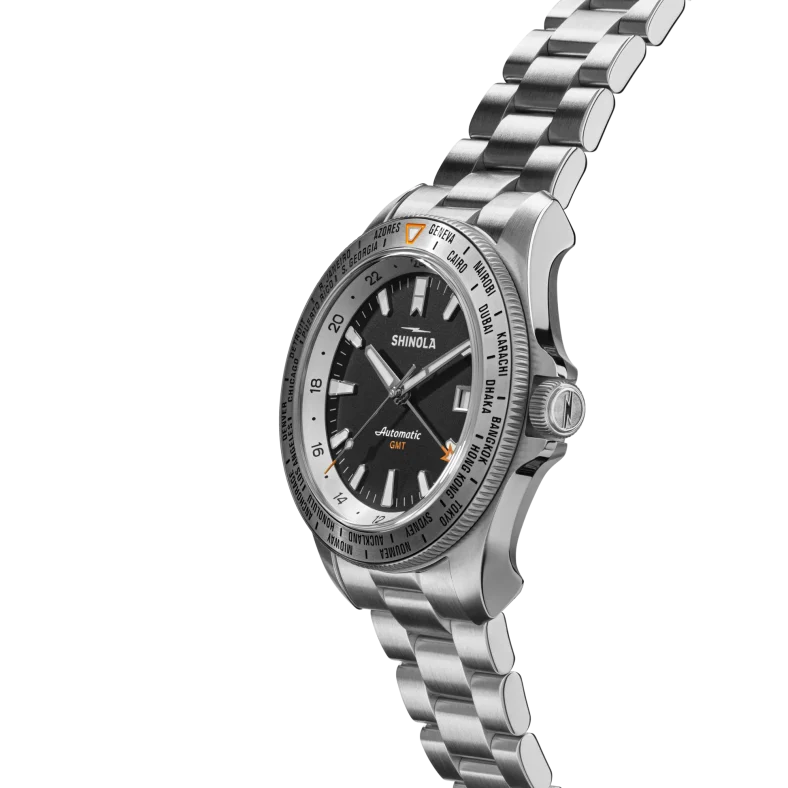 For Shinola, that means using an orange-tipped 24-hour hand paired with a unidirectional bezel featuring city names of global powers. Yet, there’s a Motor City-minded twist: Where classic worldtimer watches might feature, say, New York City, the Monster Worldtimer GMT replaces the Big Apple with Shinola’s Detroit hometown.