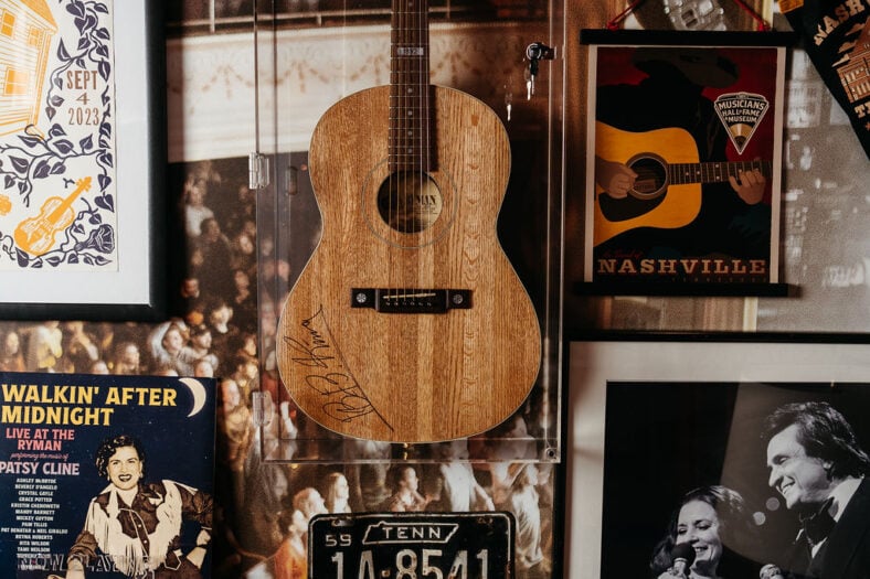 Beyond the head-turning decor, the suite houses rare artifacts that offer an intimate look at music history. The most notable item is a Washburn guitar displayed on the vinyl wall installation. Crafted from the Ryman’s original oak pews, Washburn produced only 243 of these instruments. Even more interesting? The specific guitar hanging in the suite is signed by blues legend B.B. King.