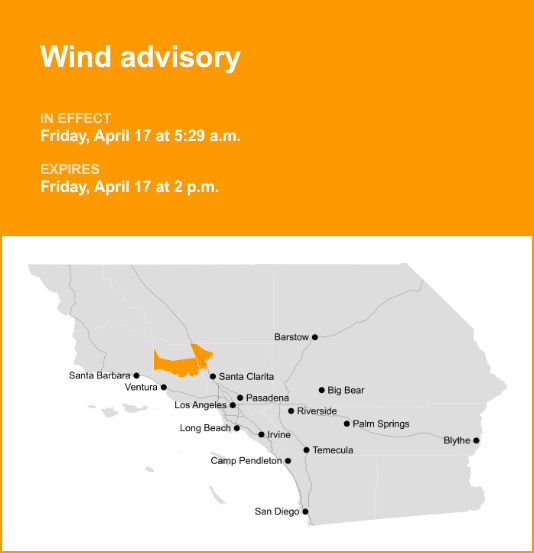 The NWS Los Angeles/Oxnard CA informs, “Northeast winds 25 to 35 mph with gusts up to 55 mph expected. Local gusts to 65 mph.”