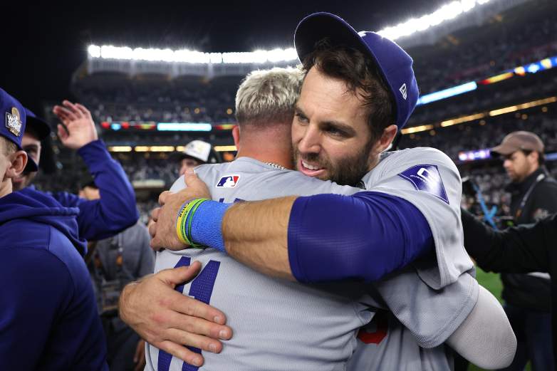 GettyNEW YORK, NEW YORK – OCTOBER 30: Miguel Rojas #11 and Chris Taylor #3 of the Los Angeles Dodgers celebrate after defeating the New York Yankees 7-6 in Game Five to win the 2024 World Series at Yankee Stadium on October 30, 2024 in the Bronx borough of New York City. (Photo by Elsa/Getty Images)