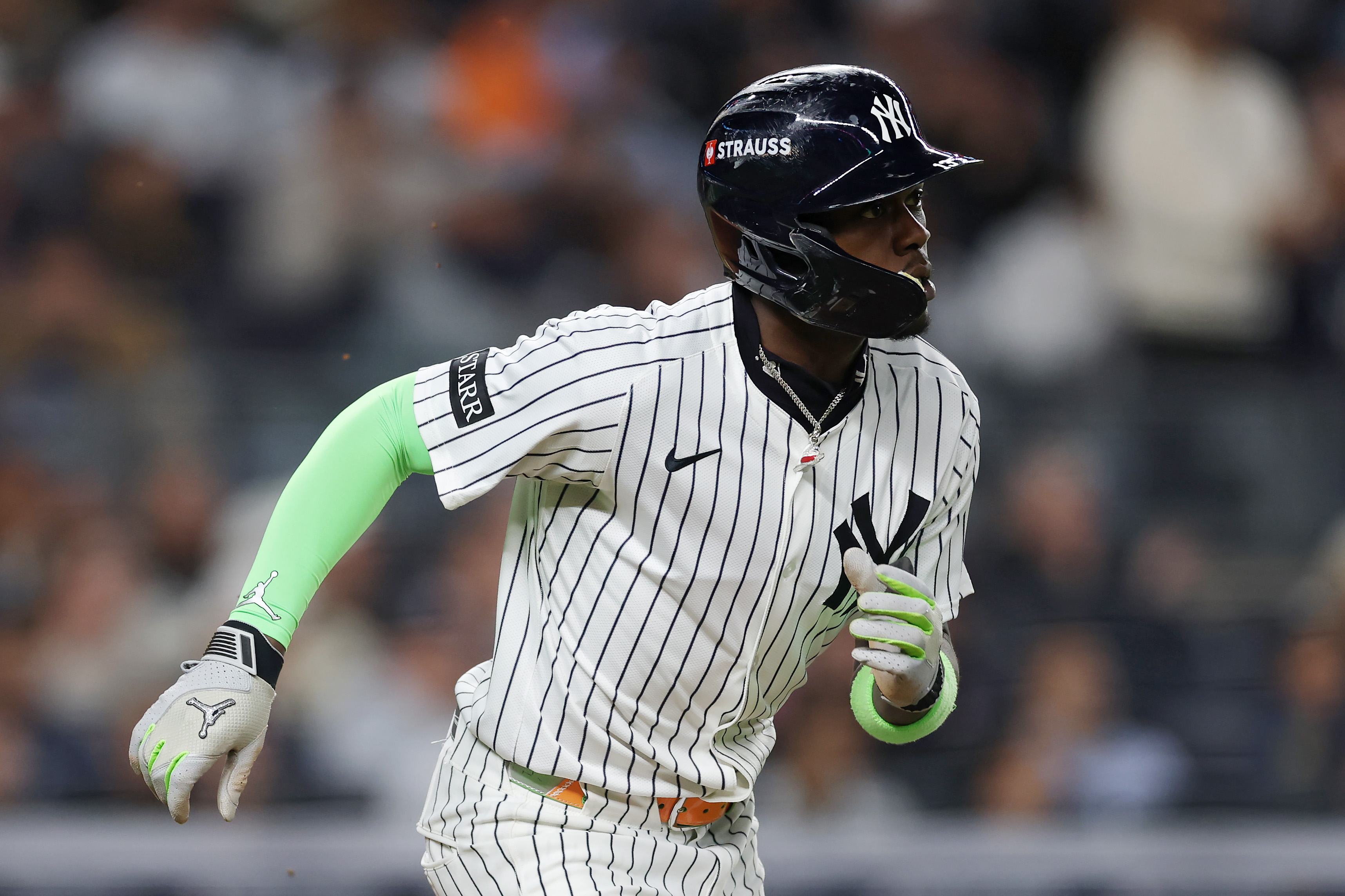 GettyJazz Chisholm Jr. #13 of the New York Yankees runs to first base during the sixth inning against the Boston Red Sox in game three of the American League Wild Card Series at Yankee Stadium on October 02, 2025 in the Bronx borough of New York City.