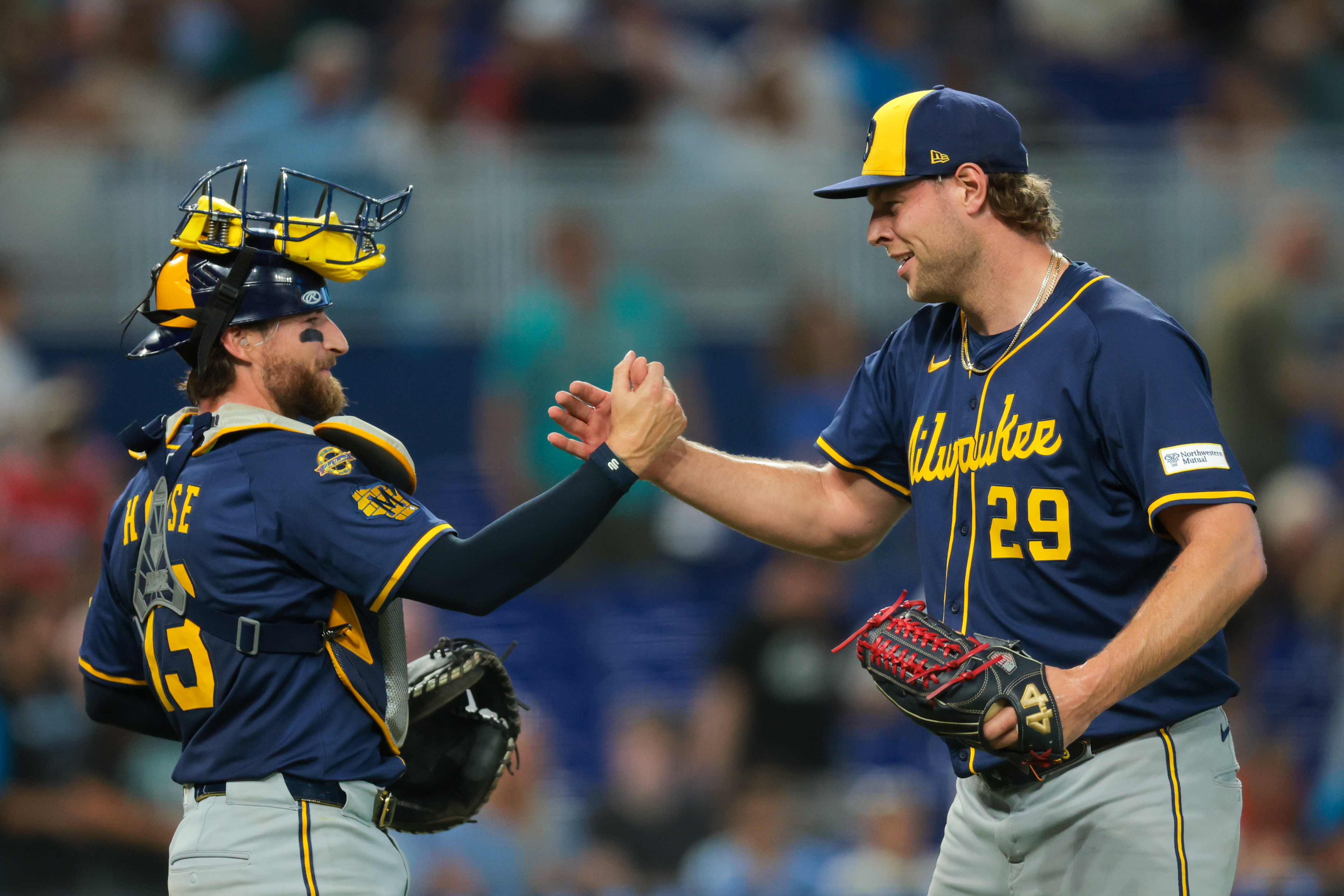 GettyTrevor Megill #29 of the Milwaukee Brewers celebrates with Eric Haase #13 following the game against the Miami Marlins at loanDepot park on July 6, 2025 in Miami, Florida.