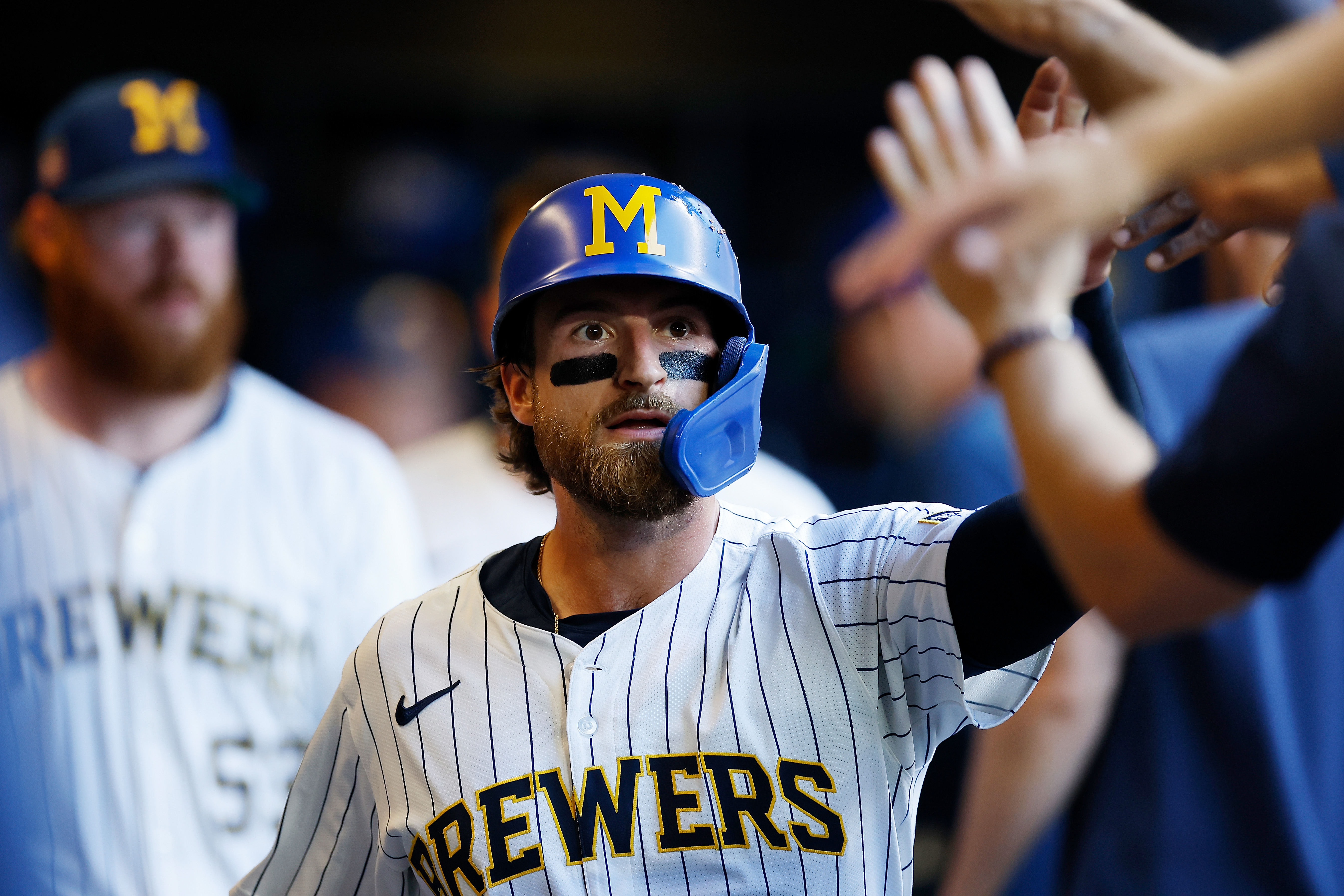 GettyEric Haase #13 of the Milwaukee Brewers is congratulated after scoring in the third inning against the Miami Marlins at American Family Field on July 27, 2025 in Milwaukee, Wisconsin.